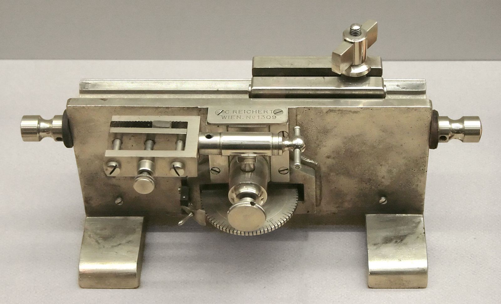 Một trong những thiết bị đầu tiên có thể tạo ra những tiêu bản có độ dày như thế được sáng tạo bởi George Adams, Jr. (1750–1795) vào năm 1770 và sau đó được phát triển thêm bởi Alexander Cummings. Thiết bị được chế tạo dạng cầm tay với ngàm giữ mẫu đặt trong một hình trụ và phần dao cắt mẫu đặt trong tay quay ở phía trên.